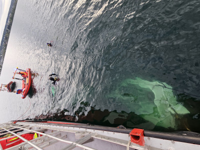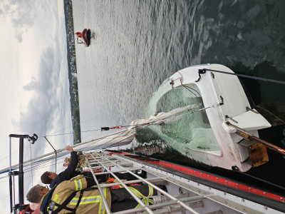 Die Feuerwehr Konstanz, der Rettungsdienst und die Wasserschutzpolizei sind bereits vor Ort. Ein gekentertes Segelboot hängt bugabwärts mit zwei Leinen gesichert am Feuerlöschboot Konstanz und droht zu sinken. Alle im Wasser befindlichen Personen sind bereits gerettet und werden durch den Rettungsdienst medizinisch versorgt.